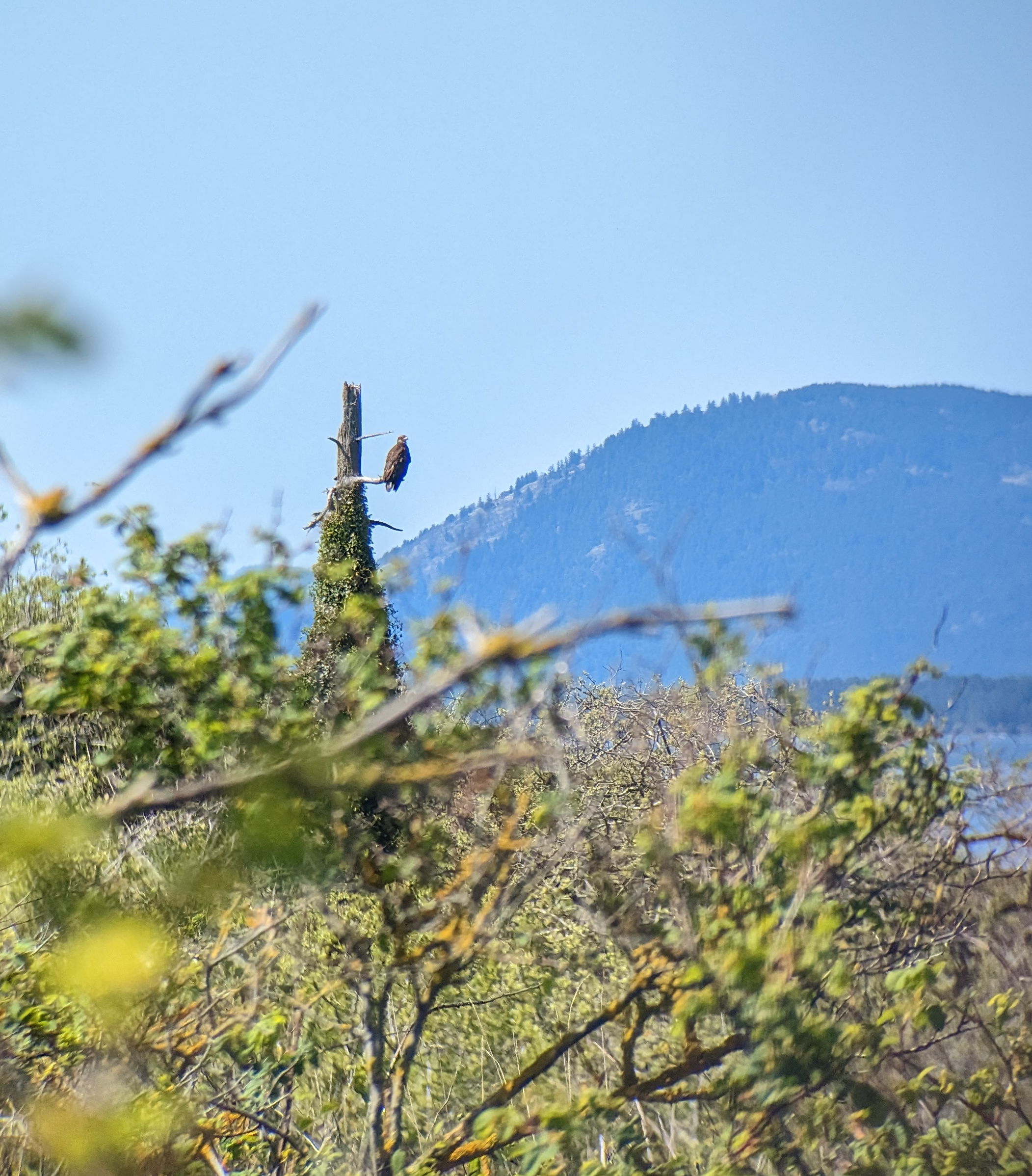 Bald eagles often come perch on the island which causes the gulls to react hysterically. To be fair, they hunt for gulls and their eggs! Below a juvenile bald eagle is perched on a tree trunk, you’ll notice its entirely brown. Like us, they grow into their “baldness” ;)